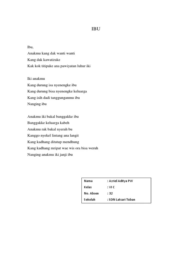 Contoh Puisi Bahasa Jawa Ibu / Contoh Puisi Bahasa Inggris Tentang Ibu Beserta Penjelasannya - 3.1 harapan yang tiada akhir.. puisi berjudul "selamat ulang tahun, sahabat." Secara umum, puisi bahasa jawa sama seperti pada umumnya karena memang ini adalah salah satu karya sastra. 17 contoh puisi bahasa arab beserta terjemahannya. Mari semarakkan bulan bahasa 2017 di sma negeri 1 prambanansleman. Pdf syair atau puisi arab sebagai budaya di kalangan.